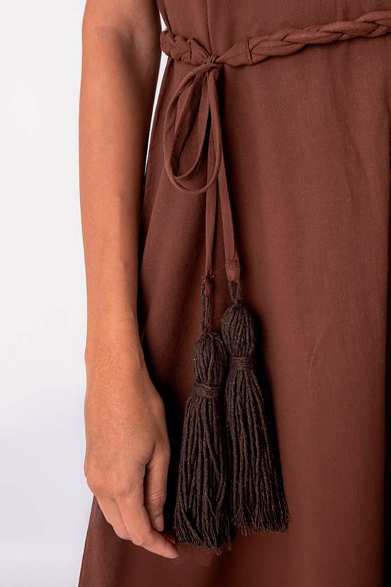 Vestido solto, forrado no mesmo tecido de algodão leve, com alças e decote trançados à mão, trazendo delicadeza e expressão manual
