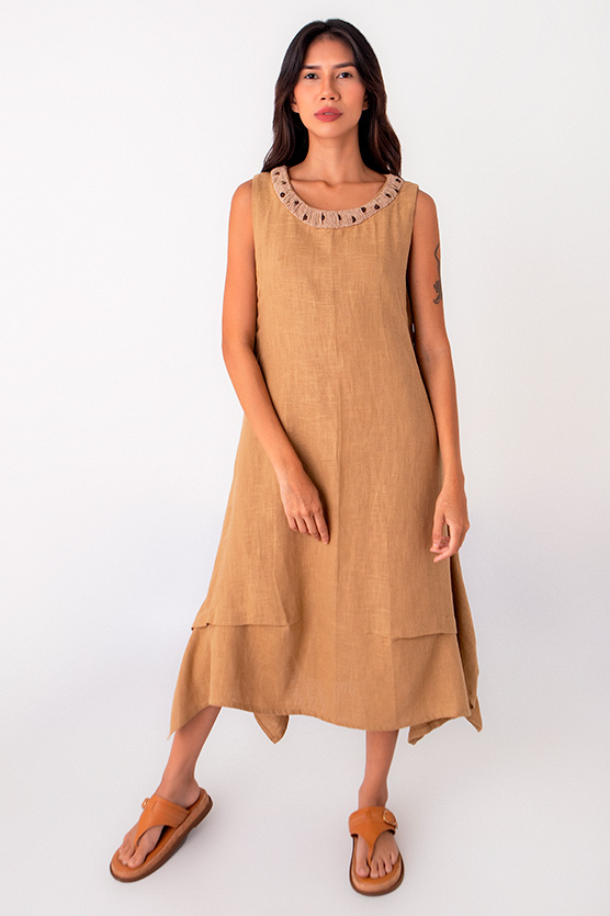 Vestido em rami com detalhe de tecelagem feito a mão ao redor da gola, enriquecido por bordado com contas amadeiradas, trazendo textura natural e delicadeza artesanal.